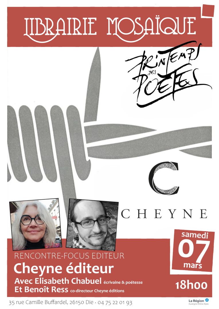 Cette année pour le Printemps des Poètes, nous avons souhaité mettre en avant la maison d’édition Cheyne qui réserve ses parutions à la poésie. Benoit Ress, co-directeur des éditions Cheyne sera notre invité ainsi que l’écrivaine et poétesse dioise Elisabeth Chabuel qui nous présentera son dernier ouvrage « Je suis le mur ».