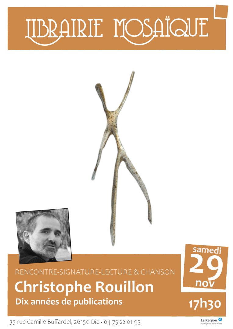 Rencontre avec Christophe Rouillon Le 29 octobre à 17h30 Christophe Rouillon – Dix années de publications Dix années, ça se fête ! Une rencontre en lecture et chanson pour découvrir ou redécouvrir les écrits, les textes, les articles, les poésies et les chansons de cet artiste local ! ← Rencontre avec Marc Bati